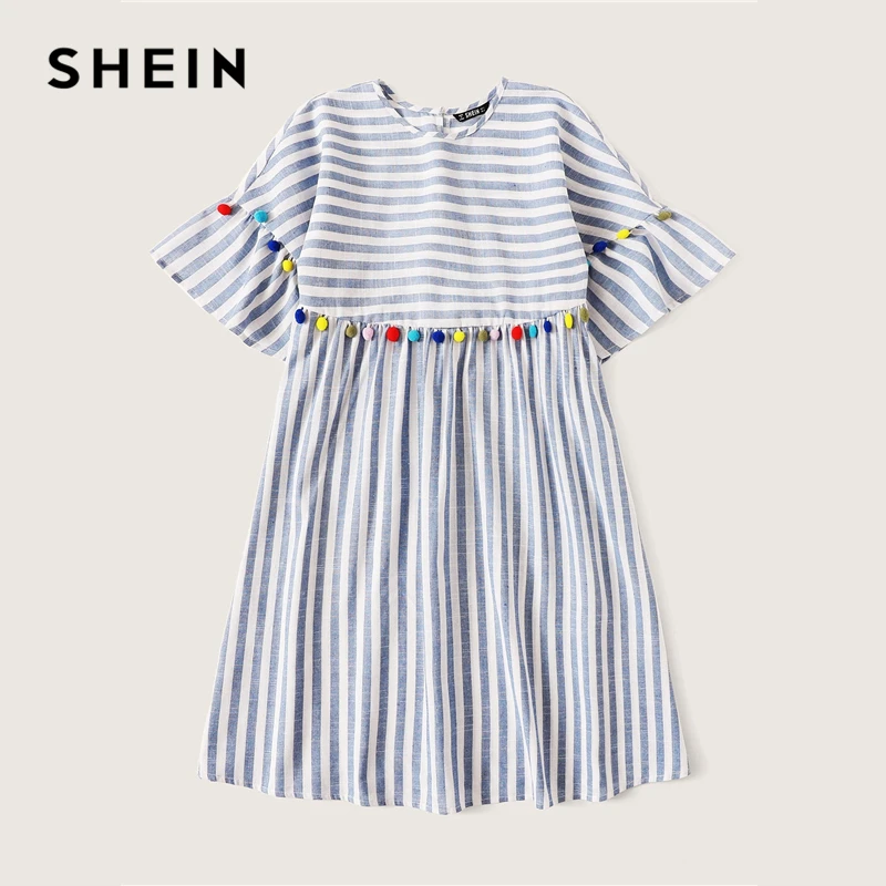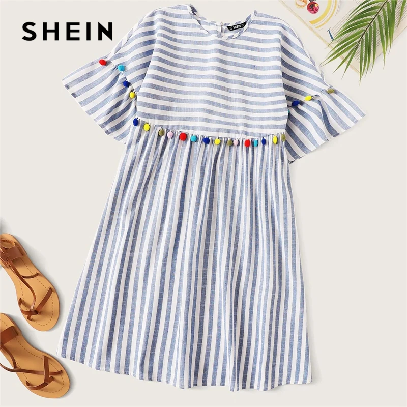 . (45% Rabatt) Günstige Kaufen SHEIN Boho Nette Blau Bunte Pompom Detail Gestreiften Kittel Sommer Kleid Frauen Hohe Taille Kurzen Tunika Gerade Kleider Preise Online.
