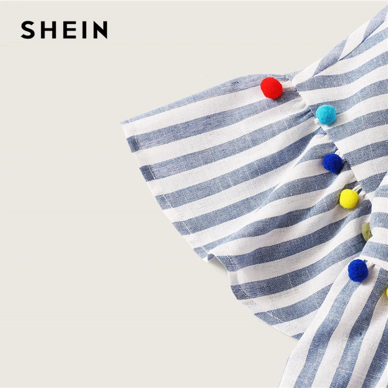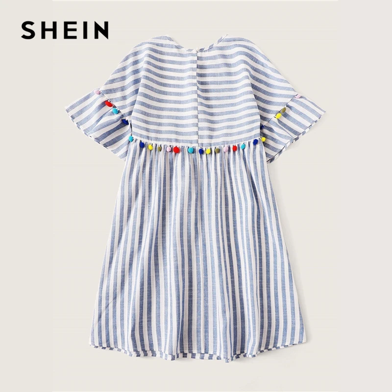 Special Offer SHEIN Boho Nette Blau Bunte Pompom Detail Gestreiften Kittel Sommer Kleid Frauen Hohe Taille Kurzen Tunika Gerade Kleider Discount 45% Today!