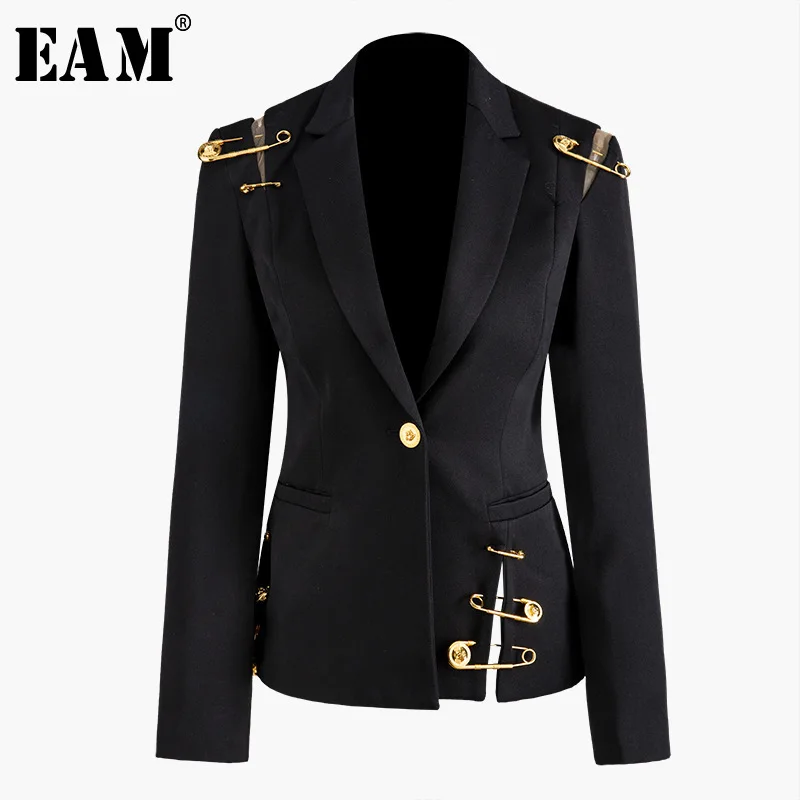 Special Offer [EAM] Lose Fit Schwarz Aushöhlen Pin Gespleißt Jacke Neue Revers Lange Hülse Frauen Mantel Mode Flut Herbst winter 2019 JZ500 Discount 19% Today!