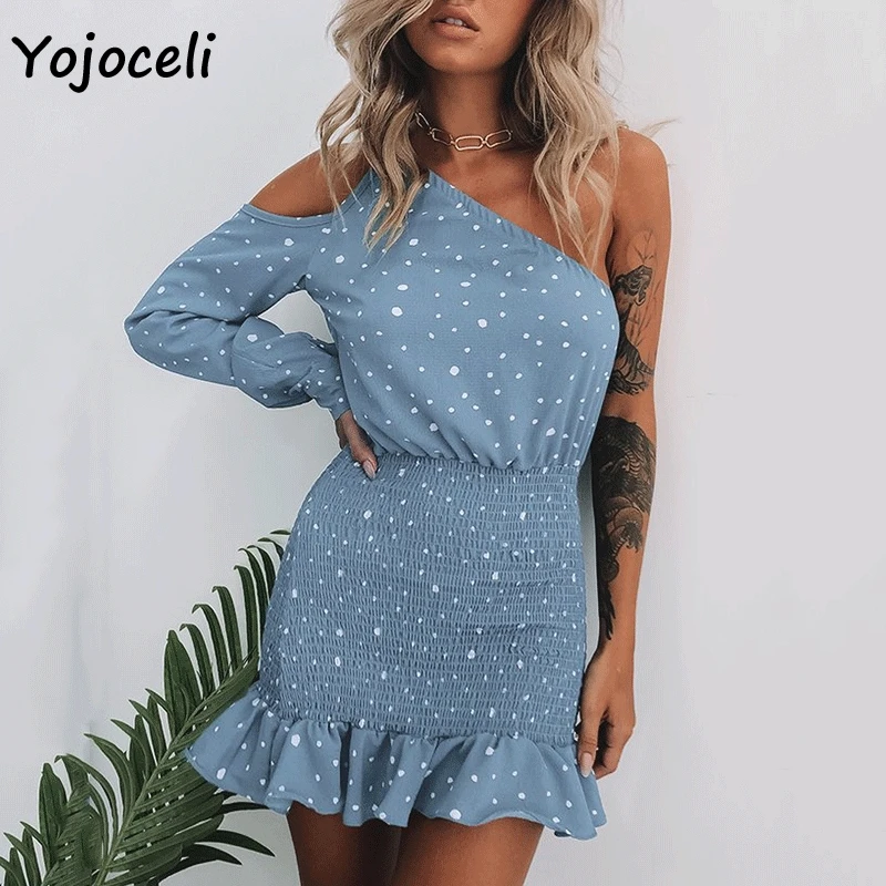 Special Offer Yojoceli sexy party club dot kleid frauen eine schulter rüsche mini kleid bodycon weibliche vestidos Discount 40% Today!