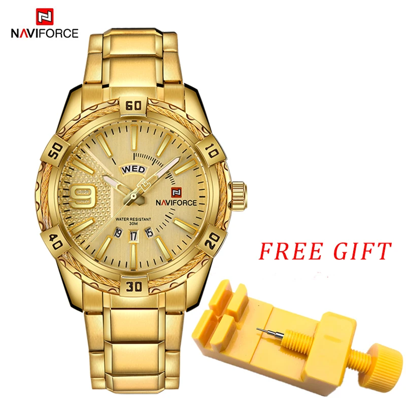 Product Name: NAVIFORCE Luxus Marke Mens Sport Uhr Gold Voller Stahl Quarz Uhren Männer Datum Wasserdicht Military Uhr Mann relogio masculino