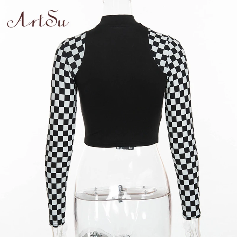 Product Name: ArtSu Schachbrett Langarm Crop Top Rollkragen Schnalle T shirt Frauen Harajuku T shirt Plaid Lustige T hemd Femme ASTS20632