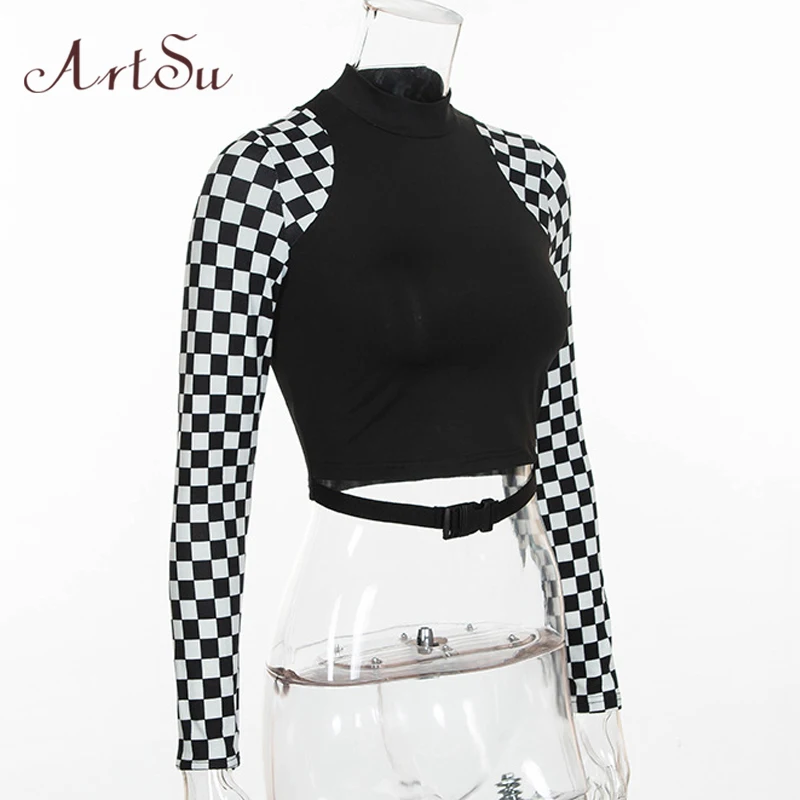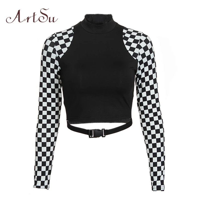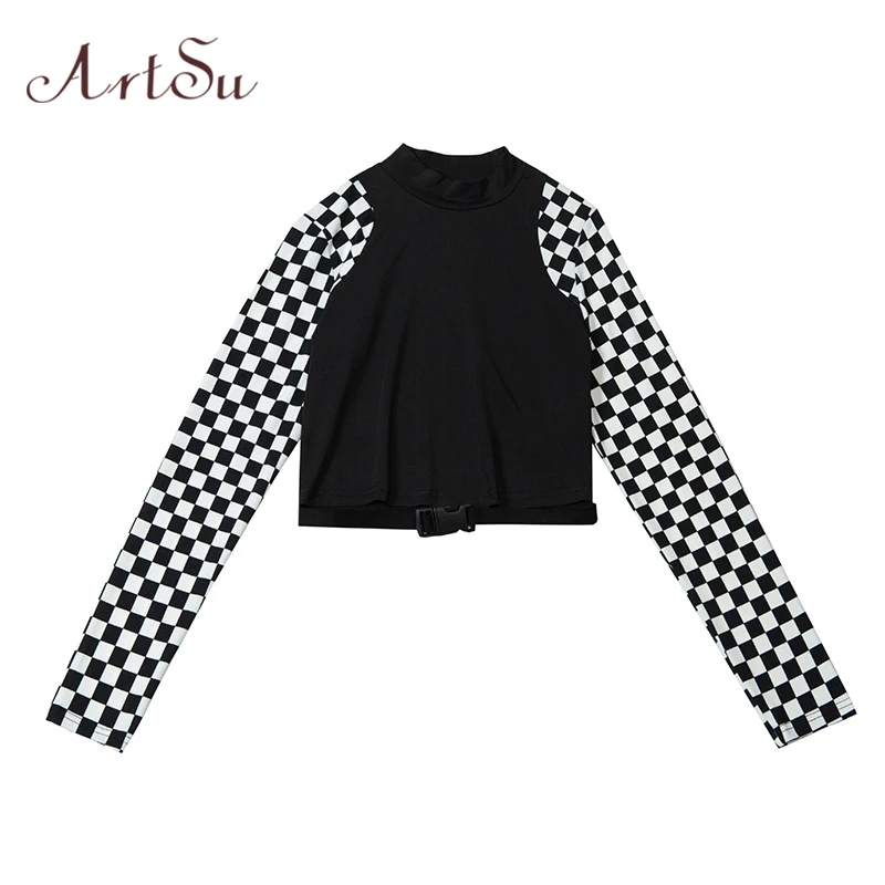 Special Offer ArtSu Schachbrett Langarm Crop Top Rollkragen Schnalle T shirt Frauen Harajuku T shirt Plaid Lustige T hemd Femme ASTS20632 Discount 45% Today!