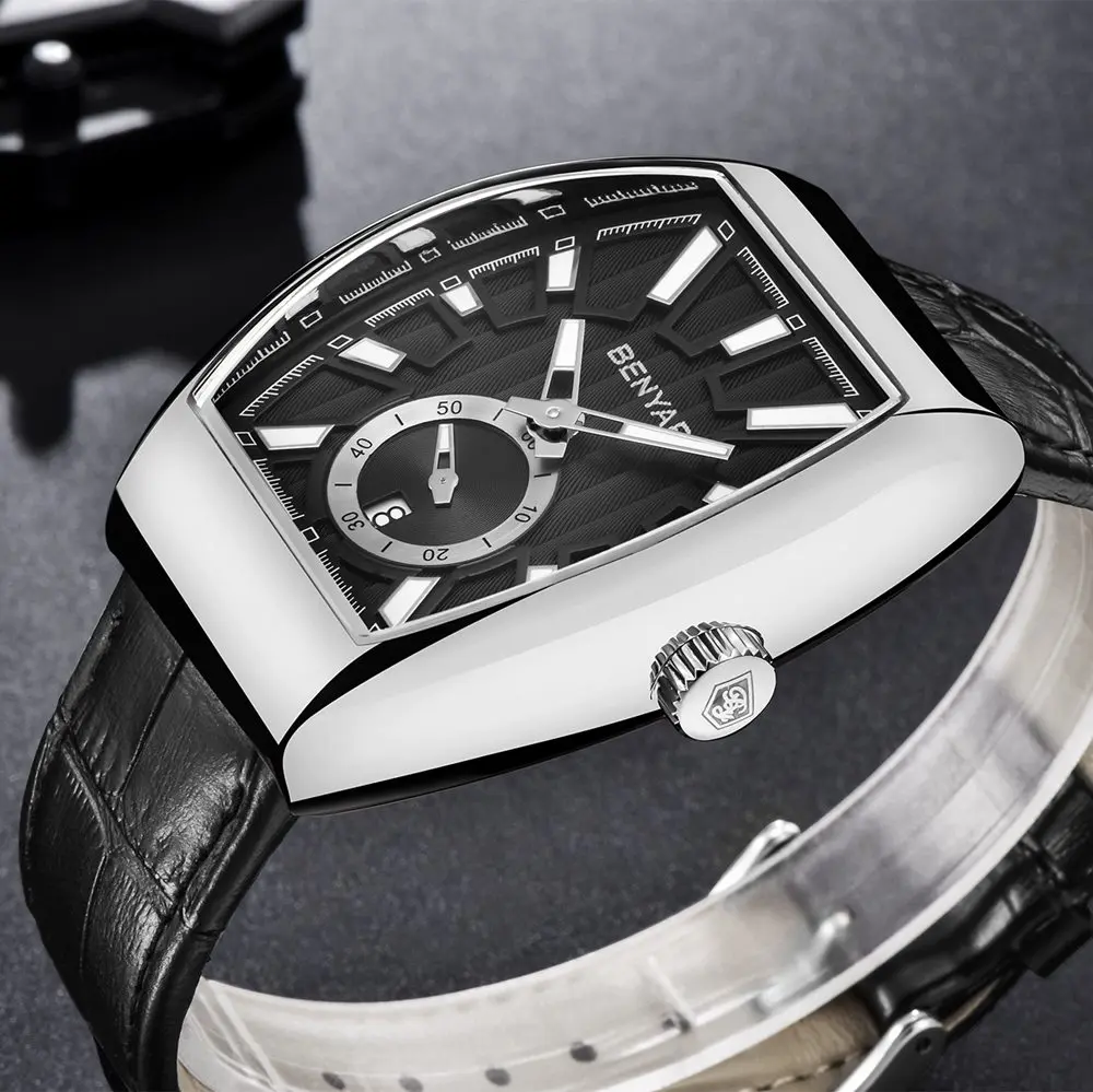 . (45% Rabatt) Günstige Kaufen Benyar Tonneau Uhr Männer Kleid Uhr Wasserdicht Quarz Echtem Leder Armbanduhr Männer Uhr Männlichen hodinky erkek kol saati Preise Online.