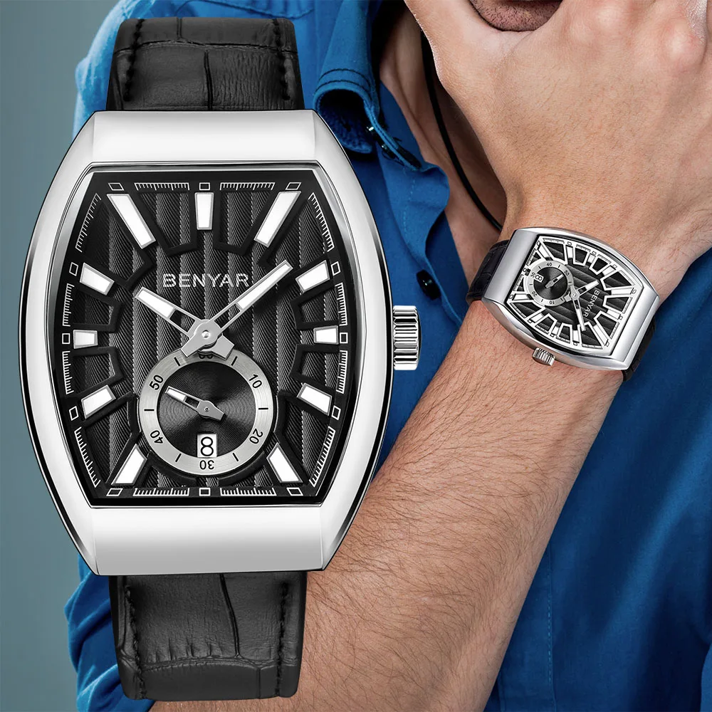 Special Offer Benyar Tonneau Uhr Männer Kleid Uhr Wasserdicht Quarz Echtem Leder Armbanduhr Männer Uhr Männlichen hodinky erkek kol saati Discount 45% Today!