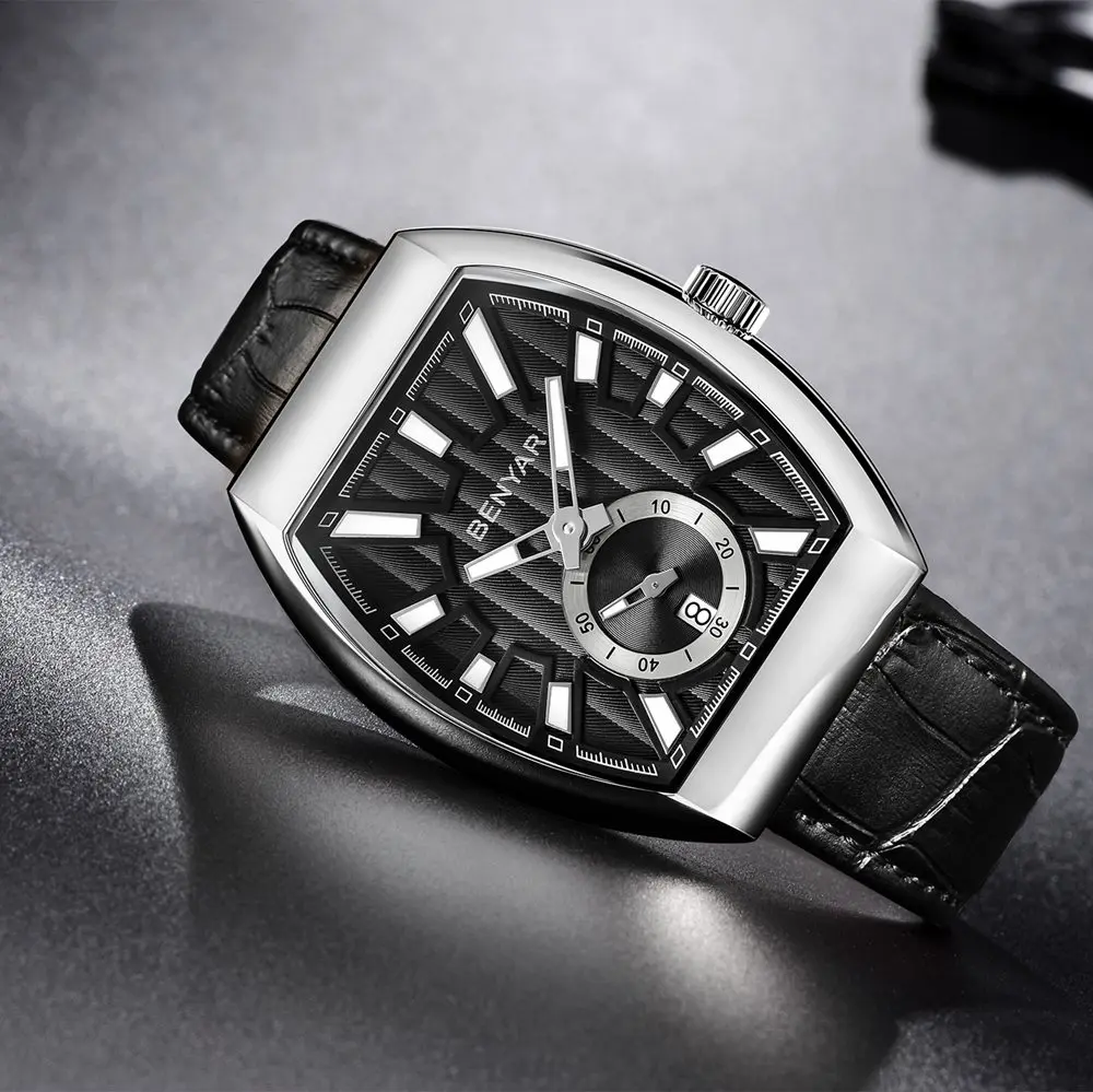 Product Name: Benyar Tonneau Uhr Männer Kleid Uhr Wasserdicht Quarz Echtem Leder Armbanduhr Männer Uhr Männlichen hodinky erkek kol saati