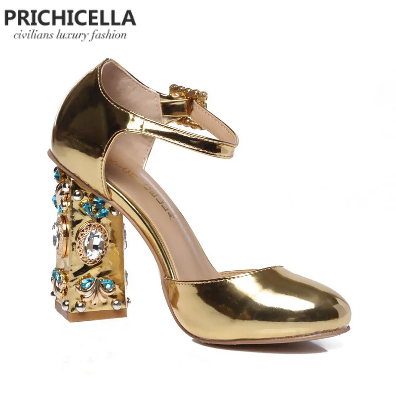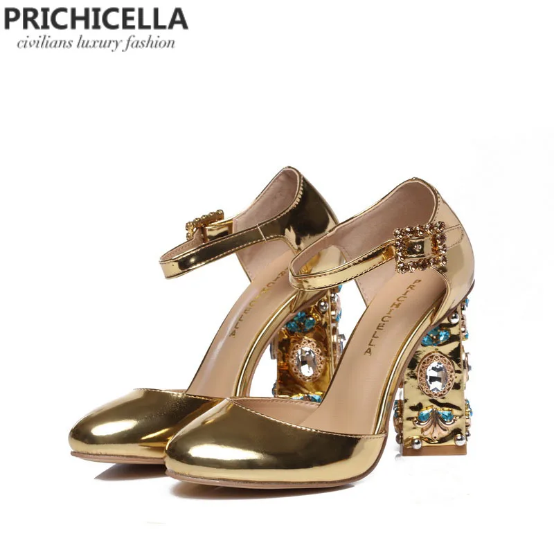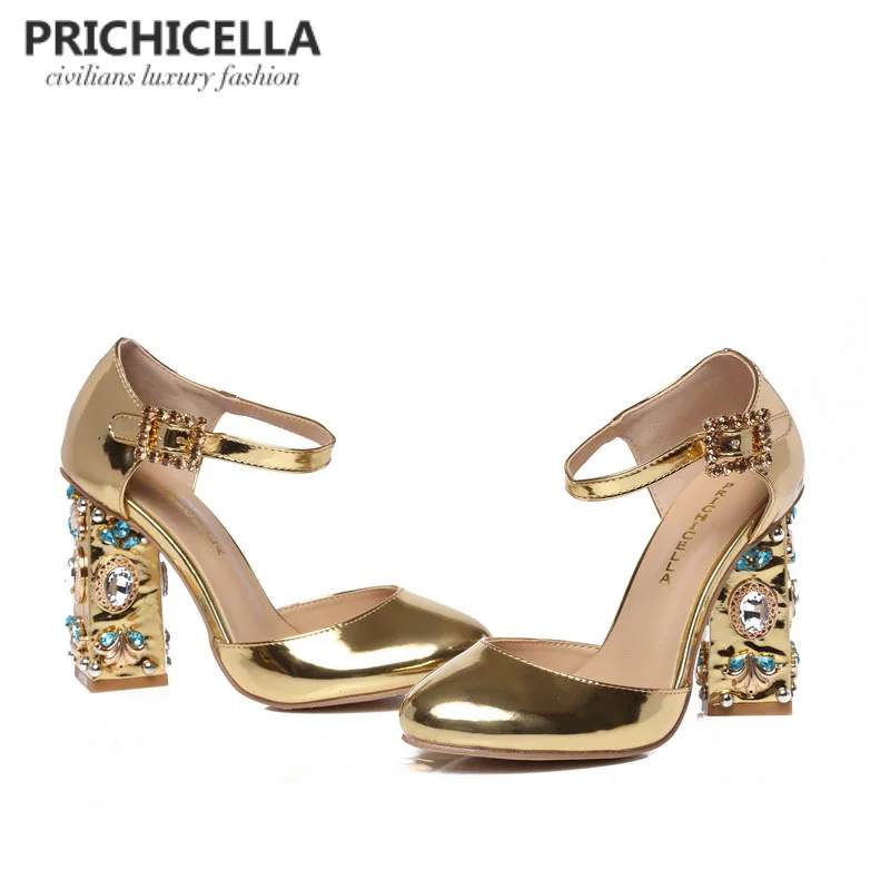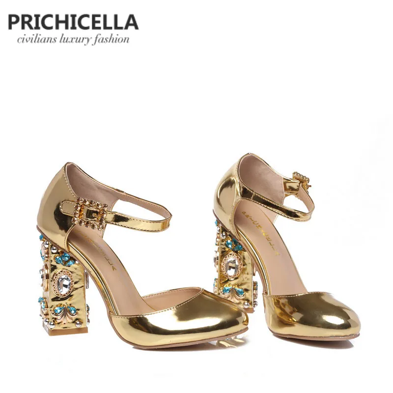 Special Offer PRICHICELLA Einzigartige frauen gold leder strass verziert blockabsatz schnalle sandalen Discount 0% Today!