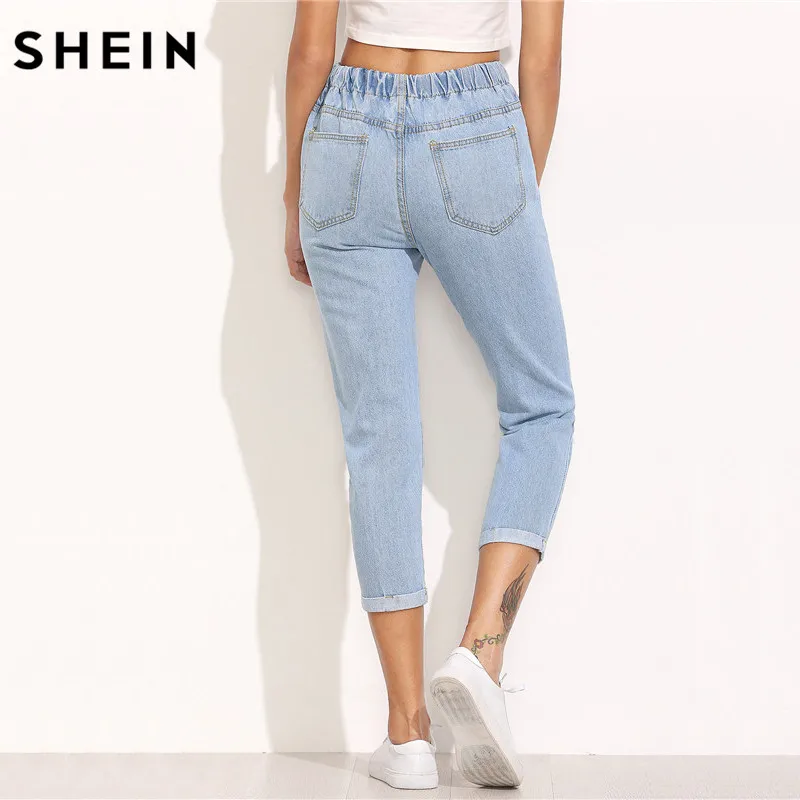 Special Offer SHEIN Frauen Sommer Hosen Casual Hosen für Damen Blau Zerrissene Mid Taille Kordelzug Dünne Denim Kalb Länge Jeans Discount 40% Today!
