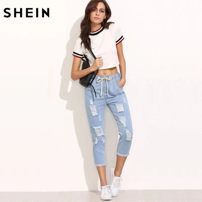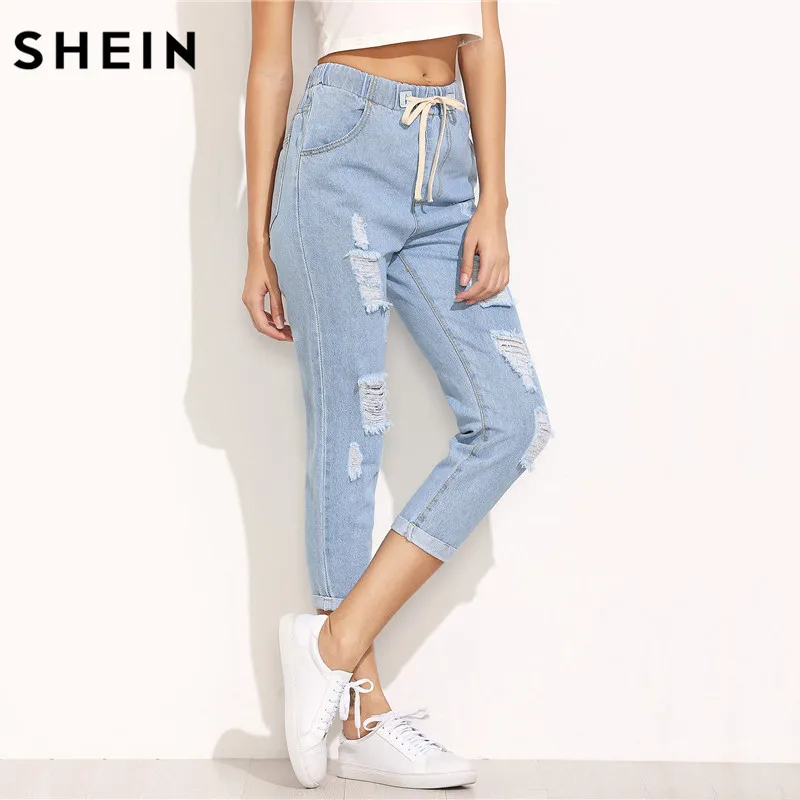 . (40% Rabatt) Günstige Kaufen SHEIN Frauen Sommer Hosen Casual Hosen für Damen Blau Zerrissene Mid Taille Kordelzug Dünne Denim Kalb Länge Jeans Preise Online.