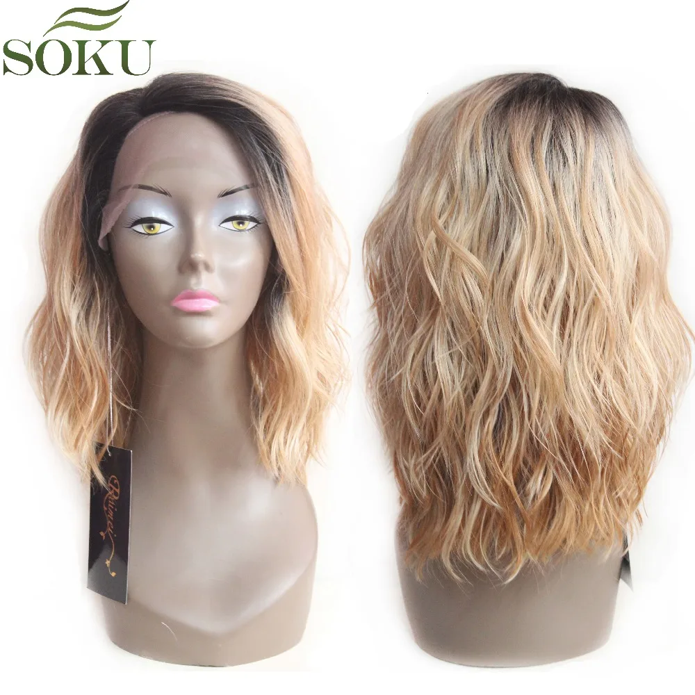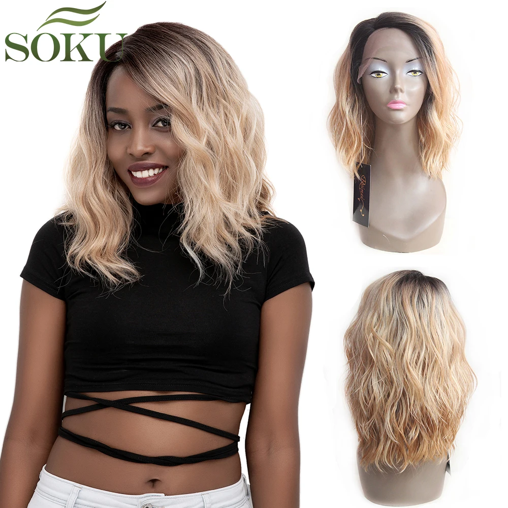 Special Offer SOKU Synthetische Spitze Front Perücken Ombre Blonde Natürliche Welle Kurze Bob Perücken Schulter Länge Tiefe Unsichtbare Seite L Teil Perücke für Frauen Discount 48% Today!